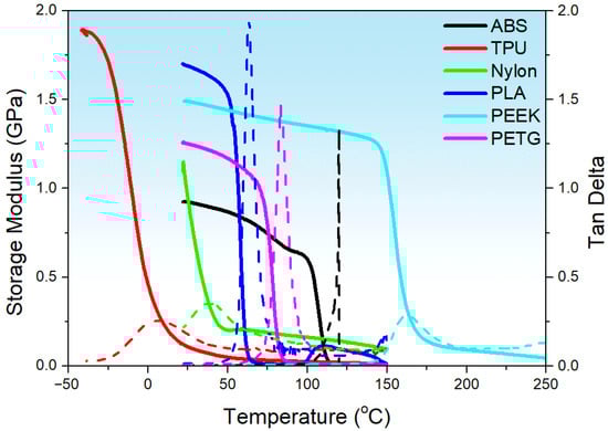 Figure 4 shows the storage modulus and tan delta of various samples under single-cantilever bending. The DMA data presented here represent the dry/ambient baseline viscoelastic response of the polymers and are used only to provide a baseline mechanical characterization. Direct correlation of humidity-driven mechanical behavior with DMA metrics requires DMA to be performed under the same humidity conditioning and will be conducted in future work. The results indicate glass transition temperatures of TPU (~−10 °C), Nylon (~50 °C), PLA (~60 °C), PETG (~80 °C), ABS (~105 °C), and PEEK (~145 °C). At ambient temperature, PEEK exhibits the highest storage modulus (~1.5 GPa), followed by PLA and PETG (~1.3 GPa and ~1.1 GPa, respectively). Nylon and ABS show intermediate moduli (~0.8–1.0 GPa), whereas TPU has the lowest (<0.2 GPa). The damping factor (tan δ) peaks highest for PLA (>1.8), indicating strong energy dissipation, with PETG and ABS at moderate levels (~1.3–1.4), as well as Nylon, PEEK, and TPU at lower levels (~0.2–0.4). These observations suggest that PEEK is suited for high-temperature, high-stiffness applications; ABS and PETG are appropriate up to ~80–100 °C; PLA and Nylon are best used below 60 °C; and TPU is optimal for low-temperature or high-damping applications.