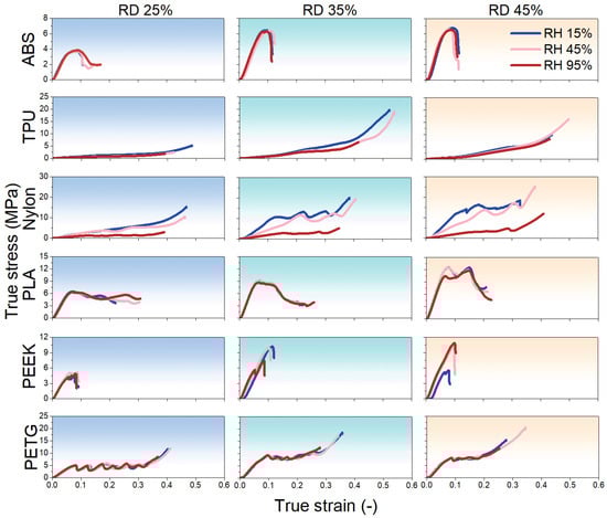 The representative compressive true stress–true strain curves at 15%, 45%, and 95% RH for all materials across three RDs (25%, 35%, and 45%). From left to right, the results at 25%, 35%, and 45% RD are presented. From top to bottom, the results correspond to ABS, TPU, Nylon, PLA, PEEK, and PETG, respectively.