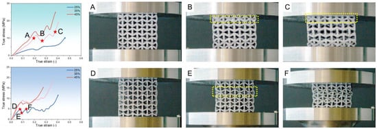 The effect of RD on the mechanical behavior of each metamaterial is now examined (Figure 8). For ABS, at all RH levels, samples with 25% RD exhibit a lower peak stress. Samples at 35% and 45% RD show nearly identical stress–strain curves. For TPU, the 25% RD samples also have a reduced peak stress. There is no clear trend in their maximum strain. For Nylon, 25% RD samples display a steady increase in true stress as true strain grows. However, both 25% and 35% RD samples show fluctuations in their true stress–strain curves. For example, at 45% RH and 35% RD, points A, B, and C in Figure 9 mark key stages. In the first stage, stress rises with strain under uniform compression. As stress increases further, the unit cell bends outward (yellow dashed region in Figure 9B), losing contact with adjacent cells and causing a temporary drop in true stress. With continued compression, that cell contacts the upper platen, resists deformation, and true stress climbs sharply again. For PLA, peak stress increases with RD at every RH level. This suggests that PLA metamaterials are highly sensitive to RD changes. A previous study [] has also demonstrated that brittle lattice metamaterials (rigid 10k resin) with a Kelvin lattice structure exhibit significant variations in stress and fracture strength with changes in RD. For PEEK, larger RD samples generally show higher peak stress, but no consistent pattern emerges. Notably, at 15% RH, the 35% RD sample records the highest peak stress. For PETG, 25% RD samples exhibit lower stress and the same fluctuations seen in Nylon. For example, at 15% RH and 25% RD (points D, E, and F in Figure 9), unit cells compact and draw closer under compression, and then a unit cell (yellow dashed region in Figure 9E) slips and bends outward, causing a brief stress drop. As the structure restabilizes, stress rises again. Further compression leads to unit cells overlapping, which eliminates fluctuations and yields a steadily rising stress curve. In summary, all metamaterials show the lowest peak stress at 25% RD. Increasing RD raises peak stress across the board. For ABS, TPU, and PETG, the mechanical behavior at 35% and 45% RD is similar. In contrast, Nylon, PLA, and PEEK exhibit a stronger dependence of mechanical performance on RD—especially PLA, where the differences are most pronounced.