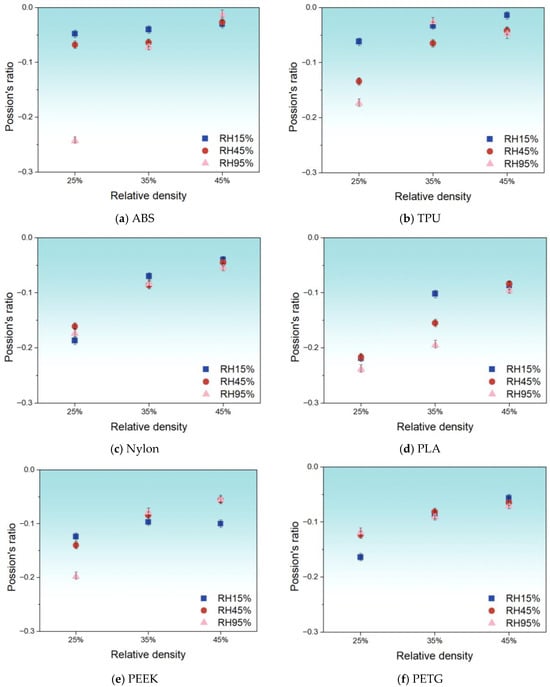 Figure 10 further illustrates how Poisson’s ratio varies according to RD under different RH conditions for each metamaterial. All metamaterials exhibit a negative Poisson’s ratio. For ABS, Poisson’s ratio increases with RD at all RH levels. The 95% RH samples show a marked change in Poisson’s ratio as structure changes. For TPU, Poisson’s ratio increases slowly with RD at 15% and 45% RH. At 95% RH, the lowest Poisson’s ratio occurs at 25% RD. It peaks at 35% RD and then decreases again at 45% RD. For Nylon, Poisson’s ratio remains nearly constant across all RD and RH levels. For PLA, trends differ according to the RH. At 15% RH, the increase in Poisson’s ratio slows with higher RD. At 45% RH, Poisson’s ratio rises uniformly. At 95% RH, the increase accelerates. At 25% and 45% RD, Poisson’s ratios are similar across RH. A significant difference appears at 35% RD: the highest Poisson’s ratio at 15% RH and the lowest at 95% RH. For PEEK, Poisson’s ratios at 35% RD are similar for all RH levels. At 25% and 45% RD, clear differences emerge. At 25% RD, the lowest Poisson’s ratio occurs at 95% RH. At 45% RD, it is lowest at 15% RH. For PETG, Poisson’s ratio trends with RD are similar across RH levels, except that at 15% RH and 25% RD, the Poisson’s ratio is minimal. Additional testing was also performed on 3D-printed wood samples under both low- and high-humidity conditions at various RDs. The results show that the Poisson’s ratio increases gradually with higher RD across low and high RH levels, while decreasing with increasing RH at the same RD. Detailed results can be found in Appendix A.3.