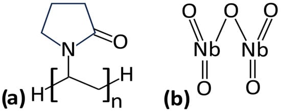 The materials that we used are poly(N-vinylpyrrolidone) (PVP) [,] with a molecular weight of 40,000 g/mol, and niobium pentoxide Nb2O5, with a diameter of around 70 nm (purity 99.9%) [,]. PVP and Nb2O5 were supplied by Sigma-Aldrich. The chemical structures of these materials are presented in Figure 1a,b.