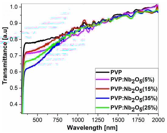 The transmission spectra of the pure PVP films and their composites with Nb2O5 nanoparticles, deposited on a microscopic coverglass, are presented in Figure 3. These measurements were performed using the transmission mode of the ellipsometer. The range of obtained spectra was limited to 2000 nm due to the large spectra fluctuations in the range of 2000–2500 nm.
