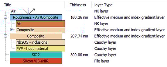 Variable angle spectroscopic ellipsometry (VASE) was used to determine the refractive index dispersion of the prepared samples. Measurements in the 240–2500 nm wavelength range were performed on PVP polymer films and their Nb2O5 composites, which were deposited onto silicon substrates coated with 300 nm of SiO2. The ellipsometric model, which was used for fitting the theoretical curve to the obtained experimental data (for the Ψ and Δ ellipsometric angles and the degree of polarization), consisted of five component layers: air, a roughness layer, a polymer/composite layer, and two substrate layers, as is presented in Figure 4. A roughness layer was modeled using the effective medium approximation model (EMA), combining the composite layer and the air layer, where air was treated as a non-dispersive medium. The polymer/composite layer was modeled using a Cauchy model for the pure polymer [,,], while the composite was modeled using an EMA-type model, fitted for PVP and a Cauchy model of Nb2O5 material layer, taken from the database of ellipsometric models that are available in SpectraRay 3 software. Finally, an air layer with a refractive index of 1 was included. The so-called volume fraction coefficient was used to determine the Nb2O5 nanoparticles content in the PVP matrix. This coefficient corresponds to the volume fraction of nanoparticles relative to the volume of polymer and is not identical to the weight percentage ratio of nanoparticles to polymer. The formula for the volume fraction coefficient f is given in Equation (1), and the obtained values are presented in Table 2.