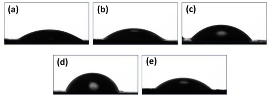 Measurements of the contact angle of PVP (a) and its Nb2O5 composites at concentrations of 5% (b), 15% (c), 25% (d), and 35% (e).