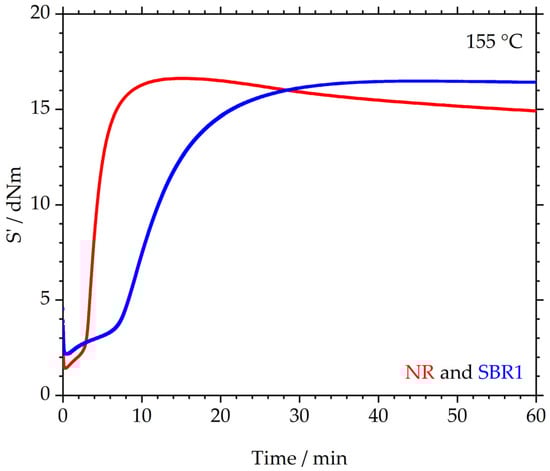 Crosslinking behavior of NR and SBR1: median curves (maximum of S’) of three measurements each.