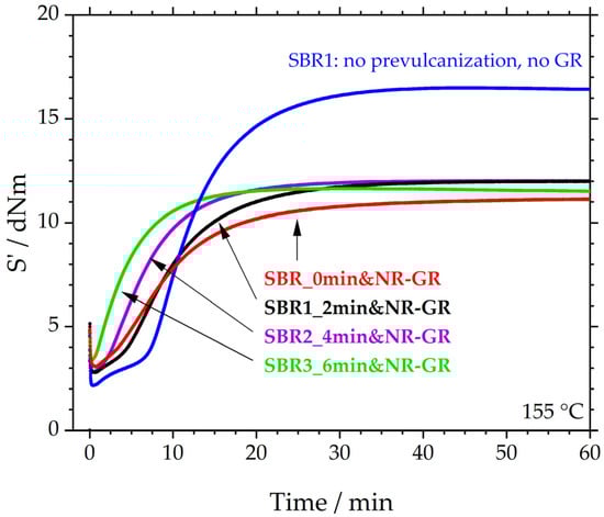 The comparison with SBR1 (blue) reveals that S’min is higher for the other four samples. This is because each of them contains 30 phr of NR-GR, i.e., already crosslinked material, which increases the initial torque. It becomes apparent that the 6 min prevulcanized specimen (green) exhibits the highest initial torque. The possible reason for this could be that parts of the matrix had already crosslinked slightly, increasing S’min.