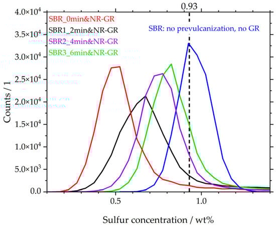 The distribution curves indicate that, apart from the matrix peak, there is no other peak representing the sulfur concentration in the GR particles. Instead, there are higher sulfur concentrations at moderate counts to the right of the matrix peaks. It therefore indicates that the sulfur concentration in the GR particles is less uniform and instead extends over a wide concentration range, e.g., from concentrations of approx. ≥1 wt% in the 2 min prevulcanized sample (black).