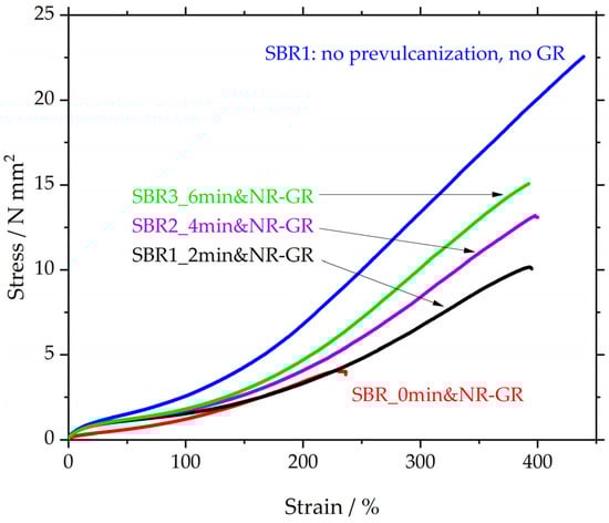 Figure 3 depicts the median (S’max) vulcanization curves of these three compounds. The S’-values of all three GR-containing samples settle on a plateau of approximately 12 dNm. These plateaus are approx. 4 dNm below that of SBR1, which was not prevulcanized, does not contain GR and serves as a reference here. Because the three prevulcanized specimens reach the same plateau, it appears that the degree of prevulcanization has no influence on the resulting S’max. Thus, the 4 dNm difference between SBR1 and the three prevulcanized samples corresponds to the general influence of the GR. This influence is underlined by “SBR_0min&NR-GR”, a sample with an identical formulation to the first three specimens. The difference from the other three samples is that the matrix was not prevulcanized before the incorporation of 30 phr of NR-GR. It is therefore a sample that represents the current manufacturing process in the rubber industry. The sample has already been examined in more detail in [,]; however, the results are illustrated here again because, together with those of the three prevulcanized specimens, they demonstrate the influence of prevulcanization. It is therefore evident that the reduction of S’max is an effect of the addition of GR and not of prevulcanization (see also Table 6).