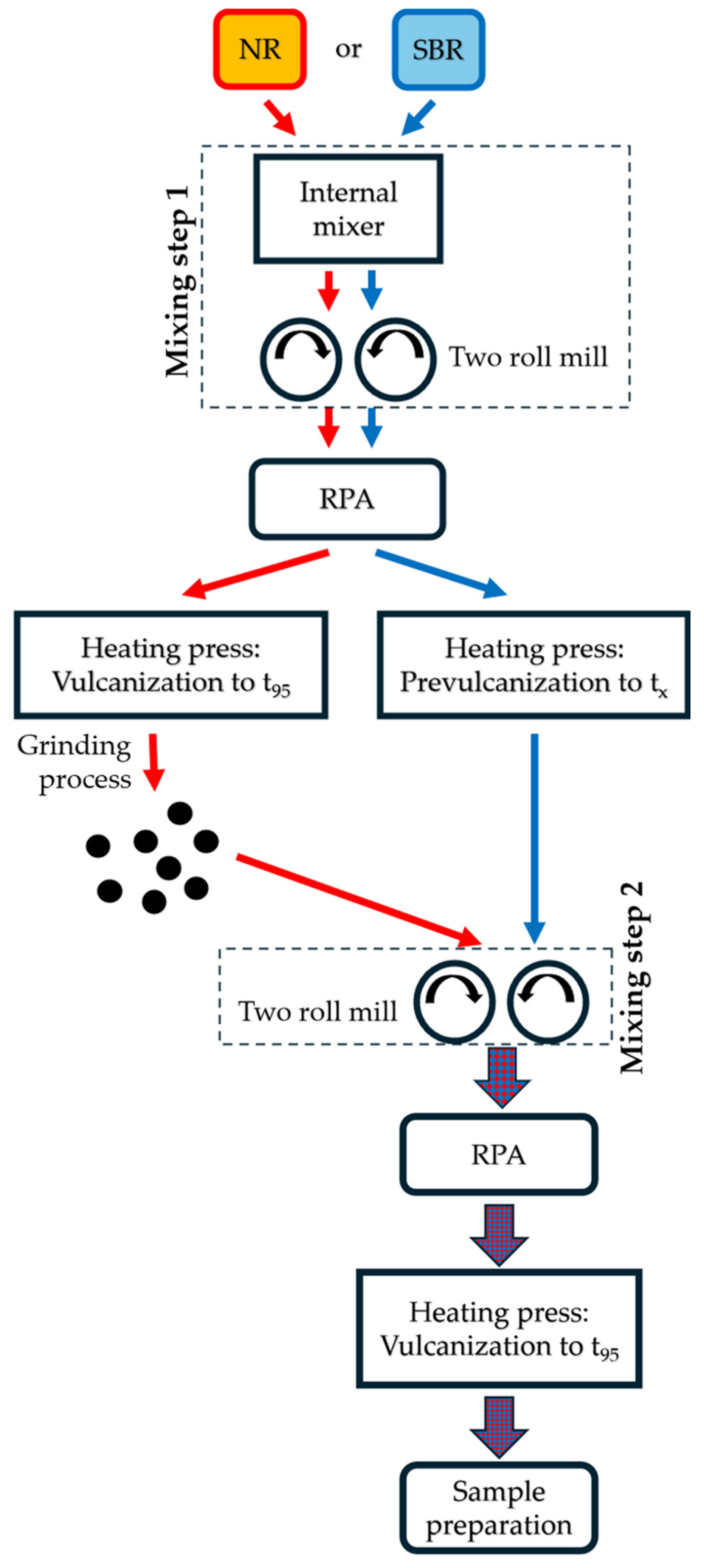 Figure 1. First, the natural rubber (NR, red) and styrene–butadiene rubber (SBR, blue) compounds are produced separately in mixing step 1. The vulcanization properties at 155 °C of both compounds are then determined in the rubber process analyzer (RPA). With this vulcanization information, the NR compound (red) is vulcanized to t