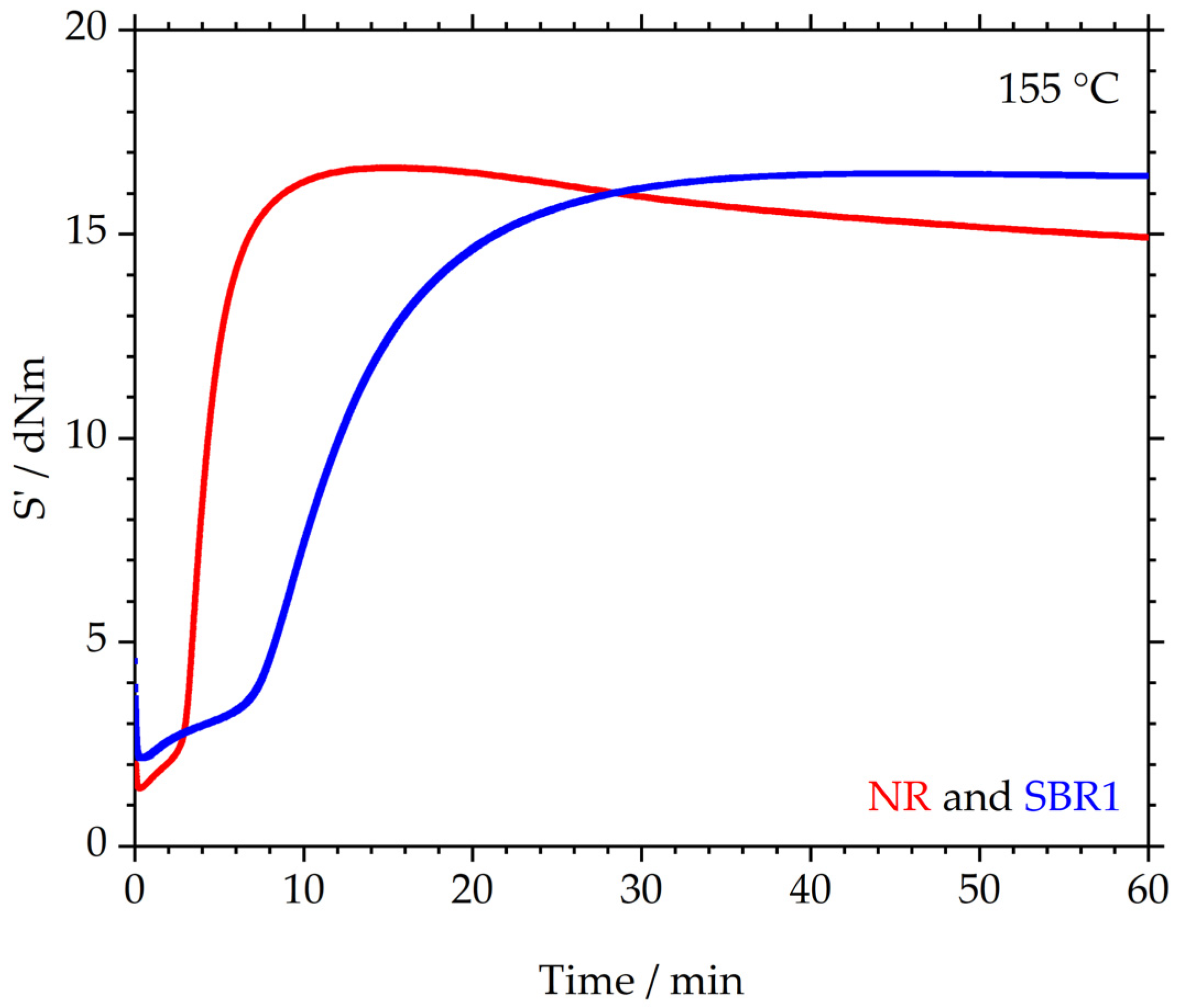 max from three measurements of the NR and SBR1 (one of three investigated SBR compounds) are illustrated. The NR shows a relatively short scorch time, after which S’ rises to a maximum value of 16.6 ± 0.2 dNm. In the following, S’ decreases again, indicating that the material shows reversion. Compound SBR1, however, behaves differently: the material reaches a plateau with a value of 16.5 ± 0.4 dNm for S’; therefore, the maximum S’ values of NR and SBR1 are at an identical level, taking the measurement error into account. Furthermore, the scorch time of SBR1 is significantly longer than that of NR, although identical concentrations of sulfur and accelerator were used in both compounds. This increased scorch time could be due to the retarding effect of the added ZnO in the SBR, as described in [