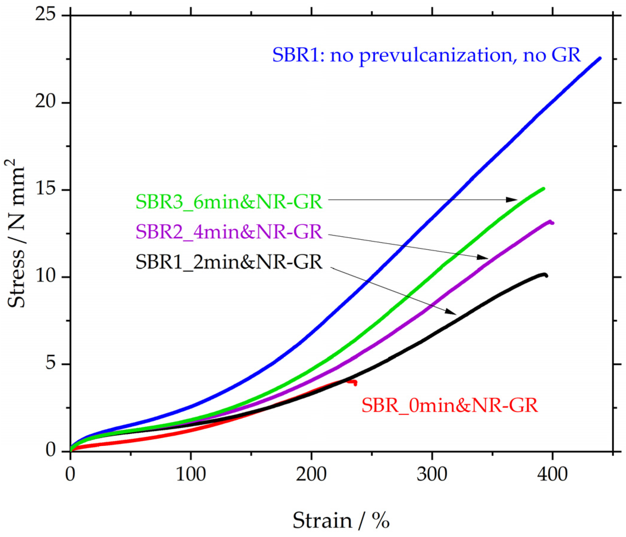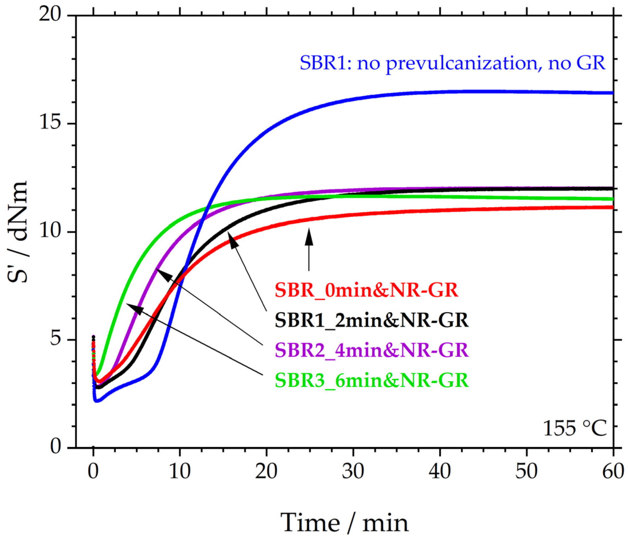 The non-prevulcanized reference SBR_0min&NR-GR also exhibits a shorter scorch time compared to SBR1. This is consistent with the findings of Gibala and Hamed [