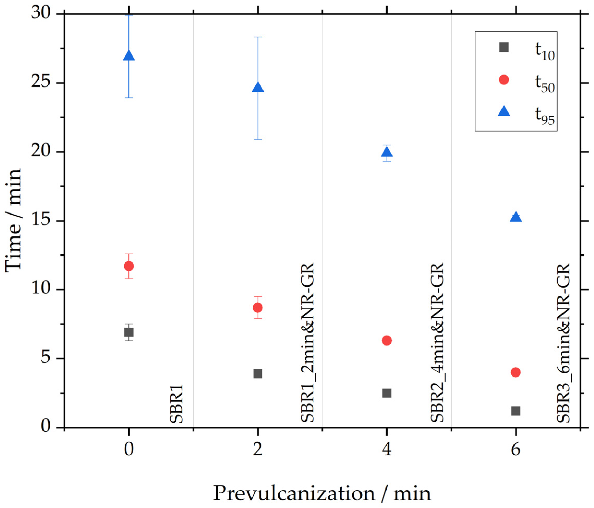 Figure 3 during the prevulcanization of the matrix material. It is evident that all three characteristic times decrease linearly as prevulcanization progresses. This reduction can be explained by the matrix material having already been prevulcanized, thereby both initiating and interrupting scorch reactions. Longer prevulcanization times of the matrix compound thus lead to shorter characteristic vulcanization times of the NR-GR-containing compounds.