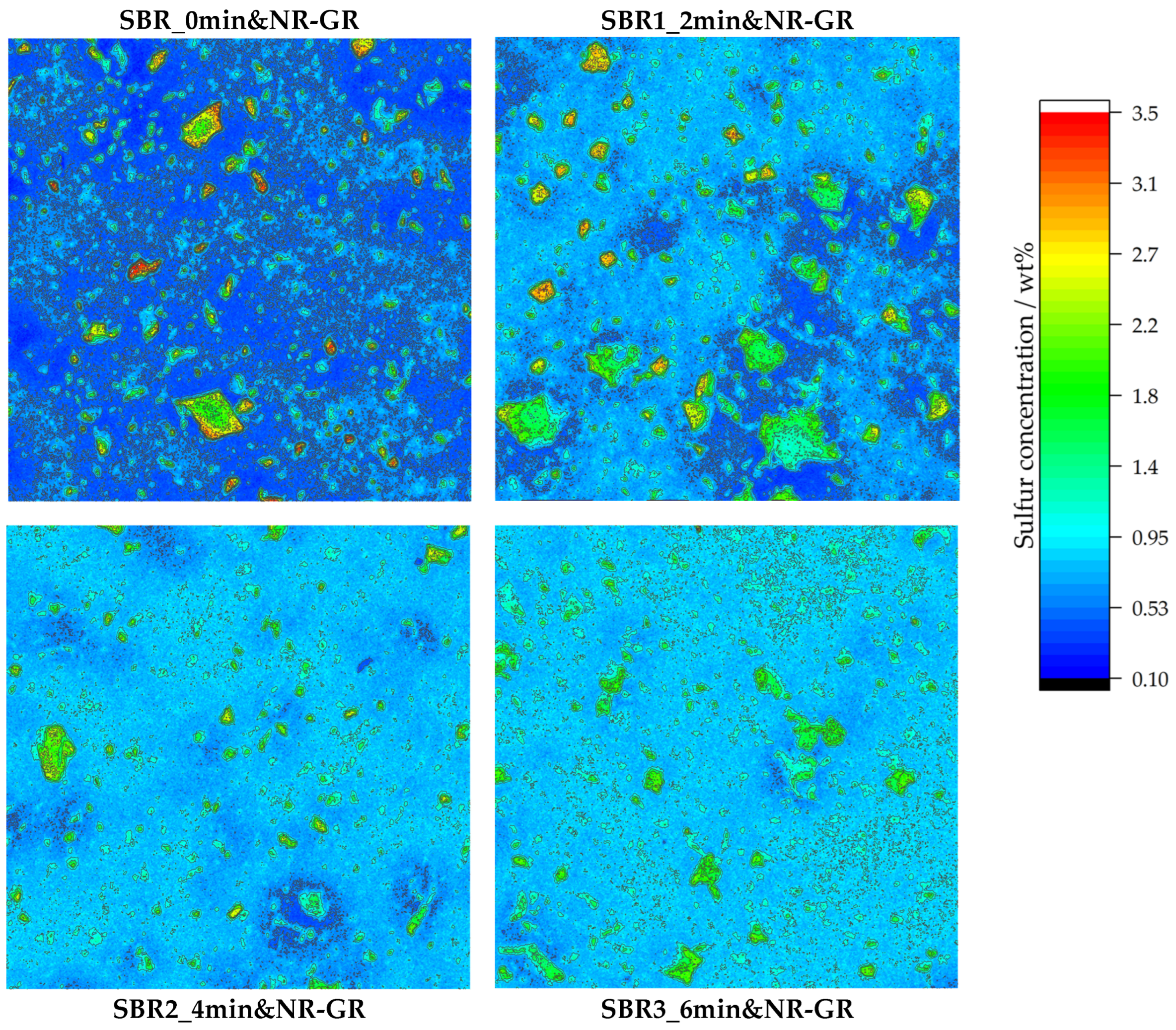 19]. The most frequently detected sulfur concentration in SBR is 0.9 wt%, but there are also zones with lower and higher local concentrations of sulfur. The curve of sample SBR_0min&NR-GR (red curve, also originating from [