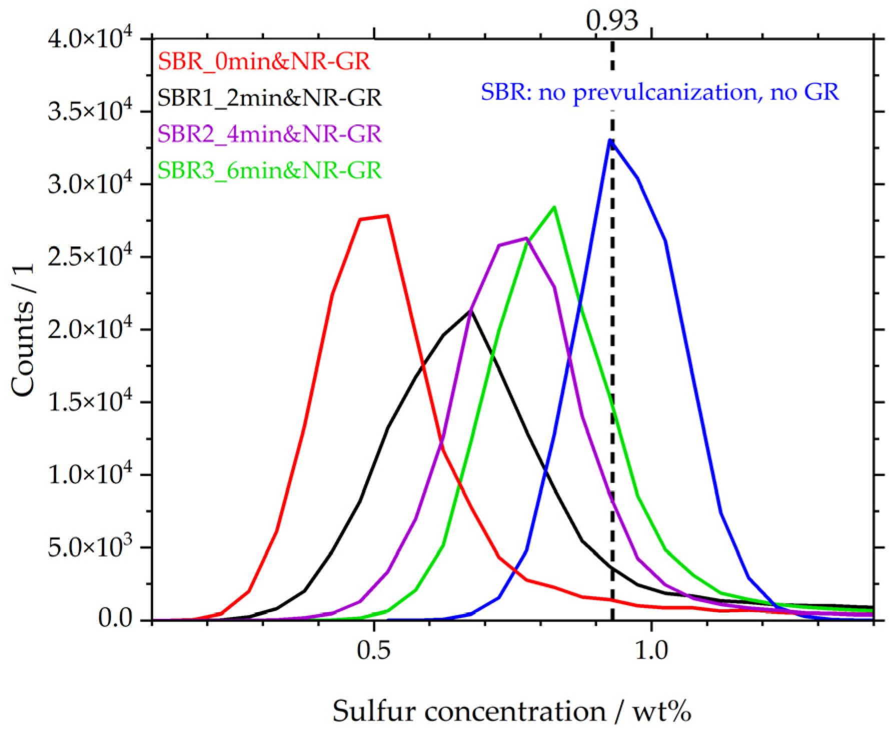 The distribution curves indicate that, apart from the matrix peak, there is no other peak representing the sulfur concentration in the GR particles. Instead, there are higher sulfur concentrations at moderate counts to the right of the matrix peaks. It therefore indicates that the sulfur concentration in the GR particles is less uniform and instead extends over a wide concentration range, e.g., from concentrations of approx. ≥1 wt% in the 2 min prevulcanized sample (black).