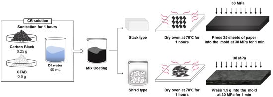 The fabrication of WPPG-stack and WPPG-shred is schematically illustrated in Figure 1. For WPPG fabrication, CB powder (Ketjen Black EC 600 JD, Lion Co., Ltd., Tokyo, Japan) and cetyltrimethylammonium ammonium bromide (CTAB, Tokyo Chemical Industry Co., Ltd., Tokyo, Japan) at the concentrations of 6.25 g/mL and 15 g/mL, respectively, were dispersed in deionized water (40 mL) to prepare a conductive coating solution. After brief stirring, the mixture was subjected to ultrasonic treatment for 1 h. CTAB acts as a surfactant, adsorbing onto the carbon surface to increase the electrostatic repulsion and enhance colloidal stability, thereby stabilizing the dispersion []. This process ensures a uniform distribution of CB particles and prevents particle agglomeration during storage and use.