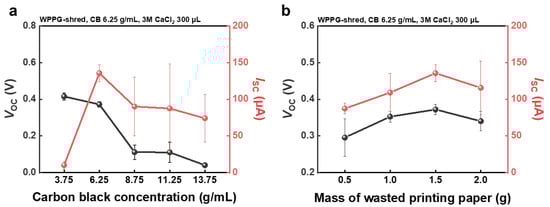 (a) Dependence of Voc and Isc of WPPG-shred on CB concentration. (b) Dependence of Voc and Isc of WPPG-shred on WPP mass.