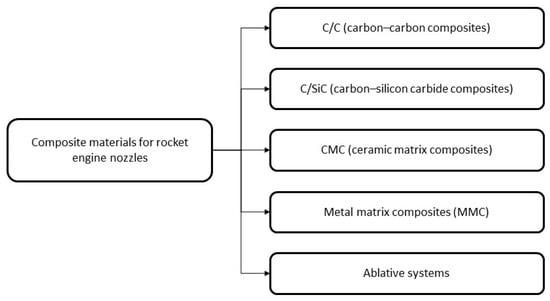 The selection of a composite material for a rocket nozzle block requires consideration not only of thermal resistance but also of numerous interrelated factors-reinforcement architecture, fabrication technology, oxidation resistance, mechanical strength, ability to withstand ablative loads, and manufacturing scalability. The review presented in this article of five key classes of composite materials-from carbon–carbon and carbon–ceramic to metal matrix and ablative systems-makes it possible to systematize their characteristics, compare advantages and limitations, and define rational application zones within nozzle designs. A comprehensive analysis of these materials is essential for the development of next-generation thermal protection solutions capable of ensuring the reliability and durability of rocket engines under extreme thermomechanical conditions.