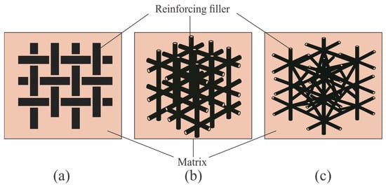 Schematic representation of reinforced composites: (a) 2D reinforcement, (b) 3D reinforcement, (c) 4D reinforcement.