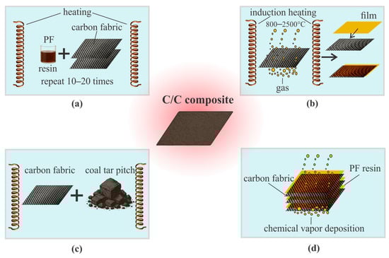 Methods for the fabrication of C/C composites: (a) PIP; (b) CVI; (c) LPI; (d) hybrid PIP + CVI.