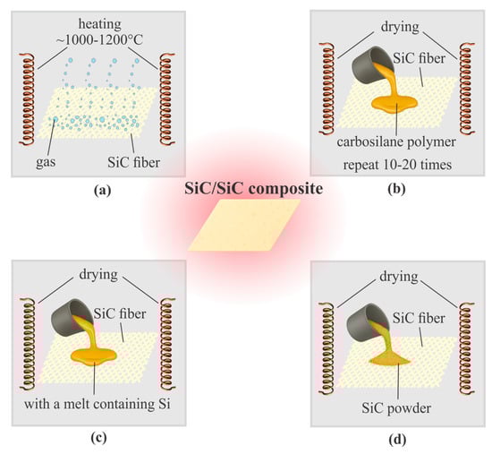 SiC/SiC fabrication schemes: (a) CVI; (b) PIP; (c) LPI; (d) Sintering.