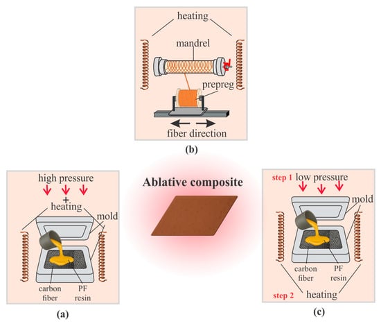 Main manufacturing methods for ablative composites: (a) compression molding; (b) filament winding; (c) 3D forming followed by sintering or vulcanization.