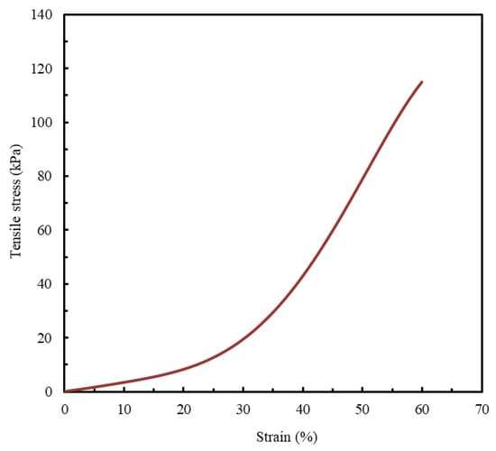 Since quantitative data on the mechanical behavior of biological LAA tissue are not widely available in the published literature, this study adopts the only experimentally obtained stress–strain curve identified, to the best of the authors’ knowledge, as a reference benchmark for model evaluation (Figure 2) [].