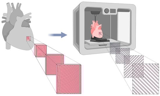 Representation of cardiac tissue anisotropy and its biomimetic counterpart fabricated using FFF. The biomimetic model utilizes a 45°/−45° infill pattern to replicate the structural alignment of natural cardiac tissue. Adapted from [].
