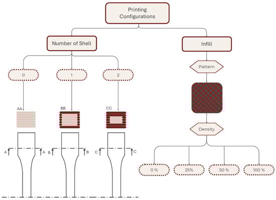The second stage of the research aimed to evaluate the impact of the two most critical printing parameters on the structural integrity of AM models: the number of shells and the infill density [,]. Figure 4 schematizes the combination of the printing parameters used in addition to the fixed parameters of the first part.