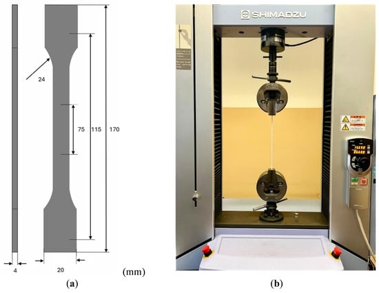 (a) Schematic representation of the samples according to ISO 527 standard []. (b) Experimental tensile test setup using Shimadzu Autograph AGS-X.