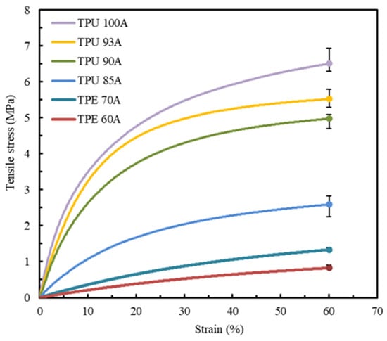 The first experimental tests were conducted to determine the tensile properties of the six polymers referred to before: TPU 100A, TPU 93A, TPU 90A, TPU 85A, TPE 70A, and TPE 60A. At least five valid tests were conducted for each combination of material and printing parameters, with the resulting strain-stress curves demonstrating a high level of repeatability. Figure 6 presents the average stress–strain curves for each material, with each sample produced using two shells and 100% infill density.