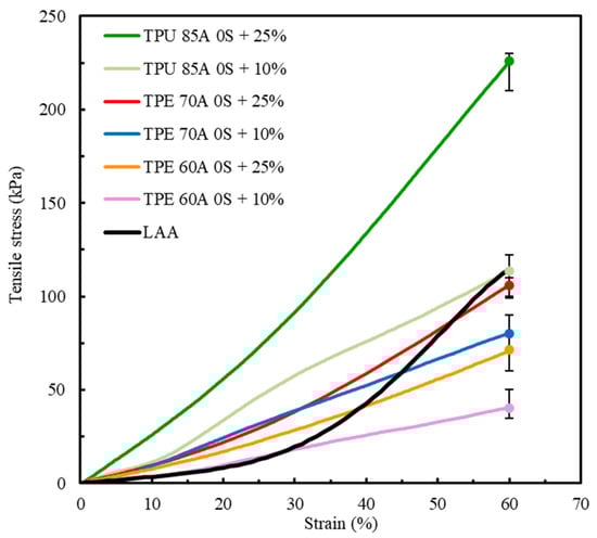 Comparison of the average stress–strain tensile curves between TPU 85A, TPE 70A and TPE 60A (this study) and LAA biological tissue [].