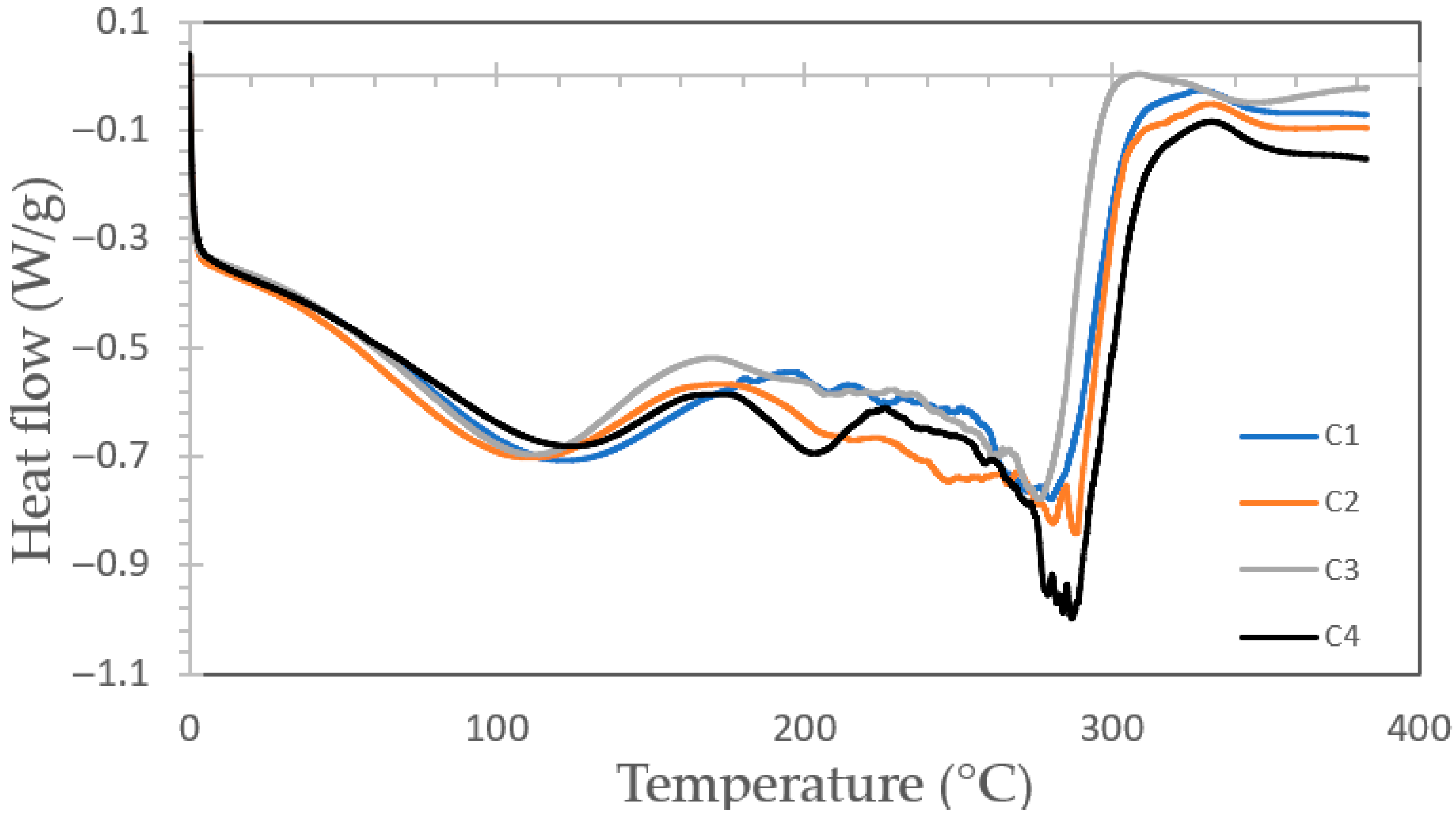 | Loss Mass (%) | TDmax (°C) | Loss Mass (%) | TDmax (°C) | ||