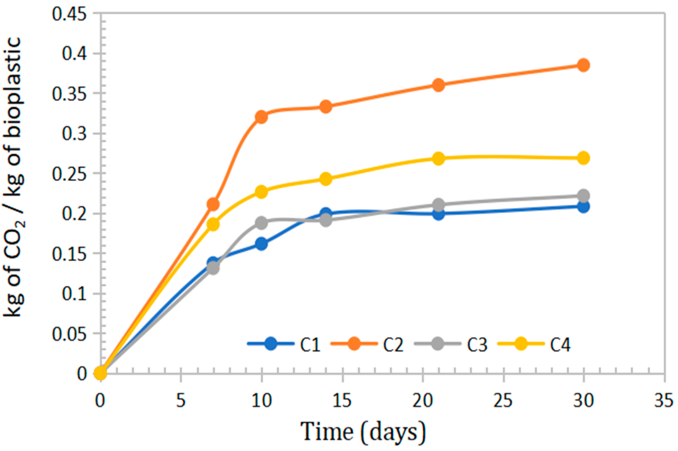 3.7. Evaluation of CO2 Emissions from Bioplastic Degradation