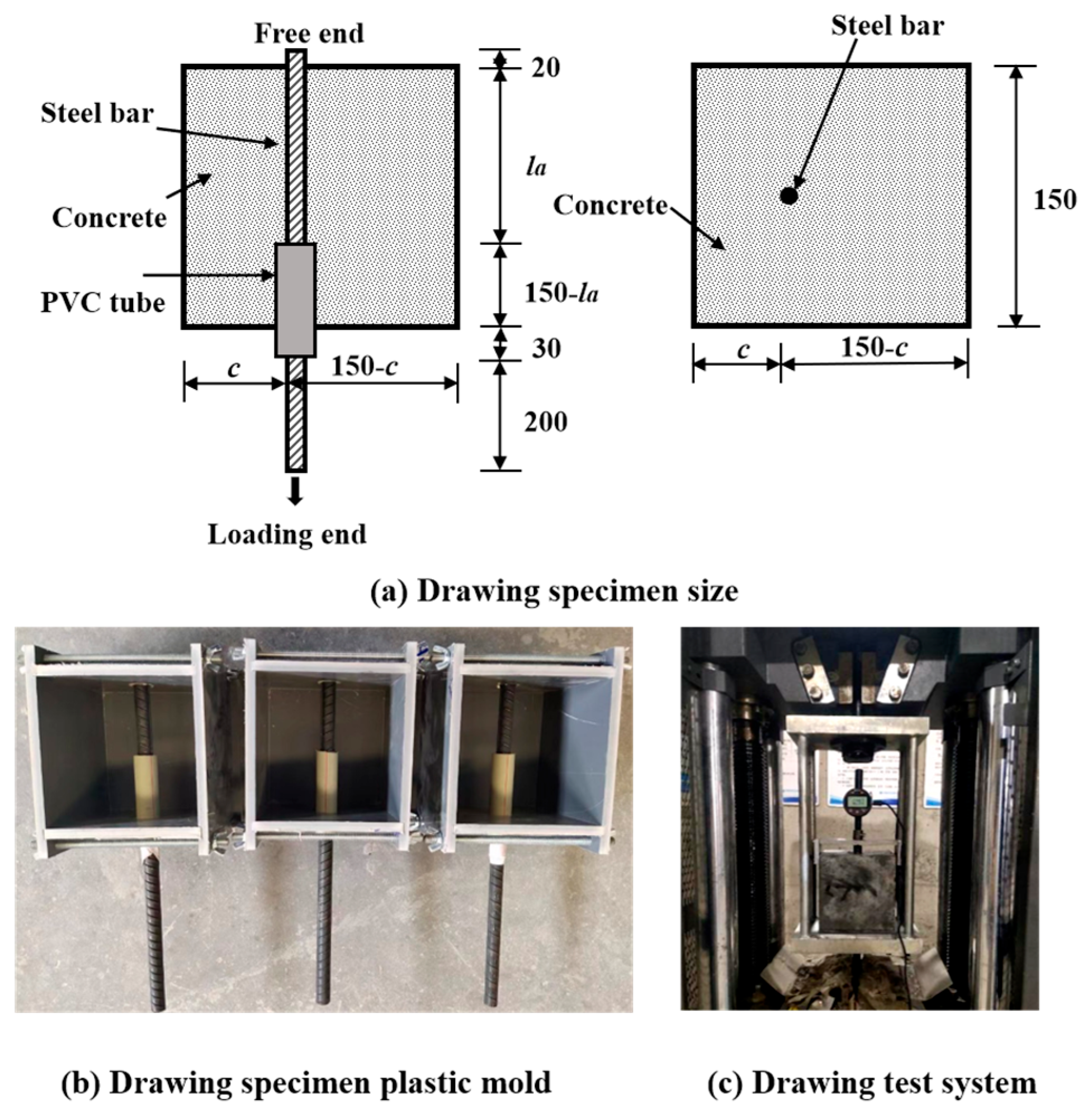 | No. | Fiber Content (%) | d (mm) | la (mm) | c (mm) | Steel Bar Surface Morphology |