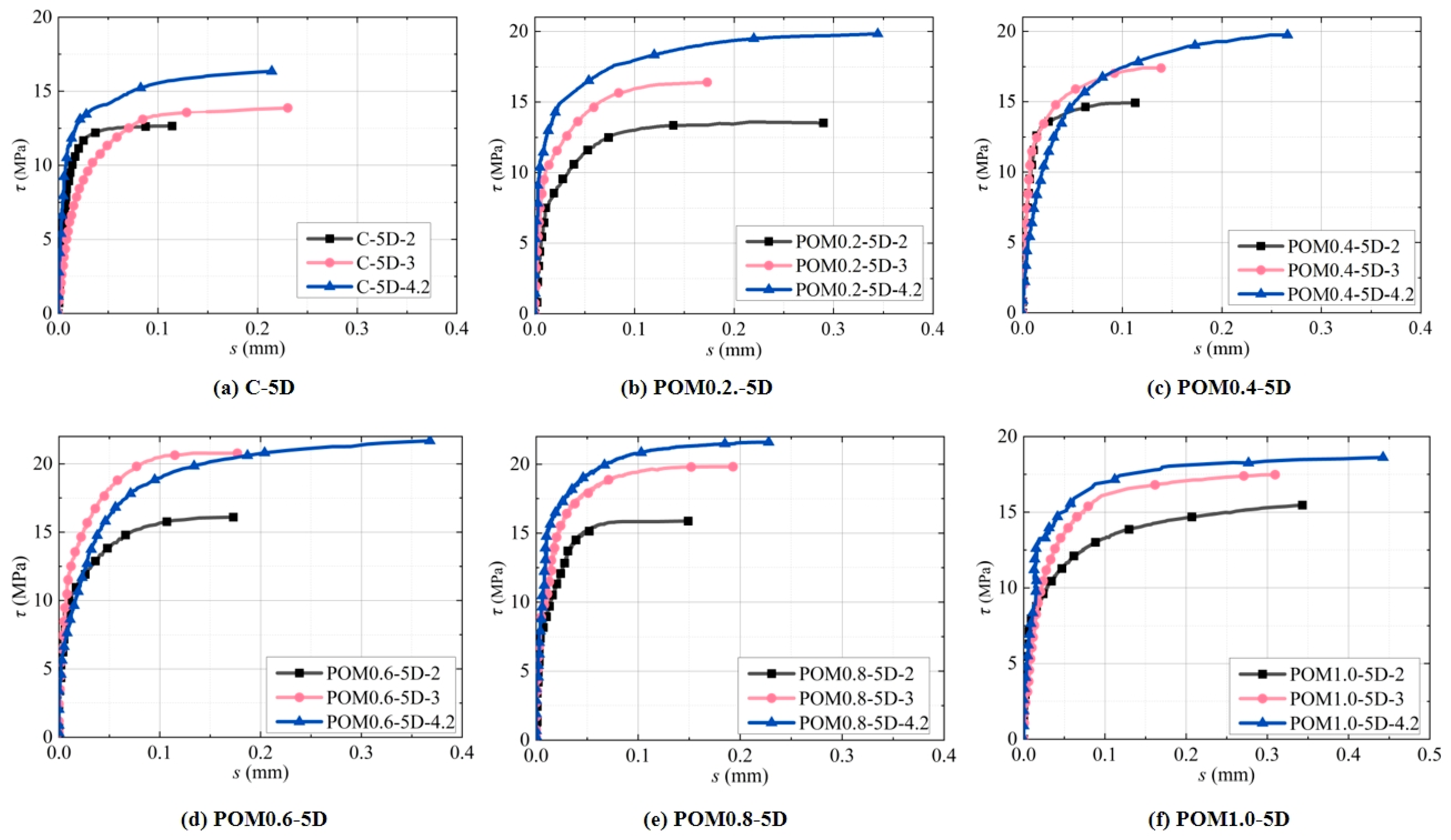 - From the existing bond–slip curve calculation model, a 28 d bond–slip curve model for the deformed reinforcement bar and CAC was established considering POM fiber content and the ratio between concrete protective layer thickness and reinforcement diameter. This was then compared with the experimental results. The findings indicate that the model fits well with the experimental findings.