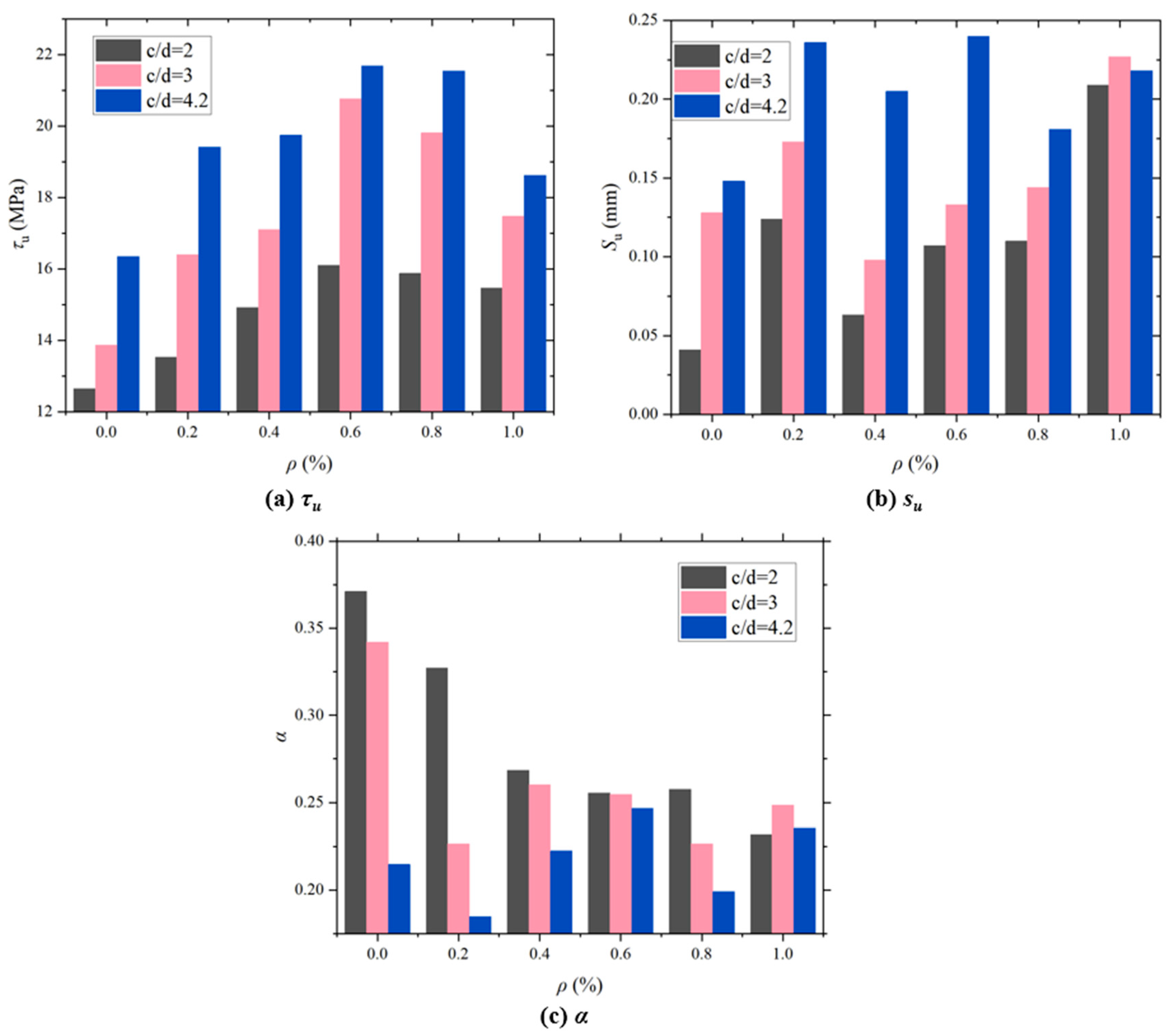 - The peak bond stress τu of the deformed reinforcement bar and POM-fiber-reinforced CAC initially rises and then subsequently declines as the POM fiber content increases, and the increase in the peak stress is the most prominent when the POM fiber content is 0.6. Compared to CAC without fiber, an increase of 49.69% can be achieved with a POM fiber content of 0.6. The shape parameter α of the slip su and the rise section corresponding to the peak stress are concentrated in a certain interval, and the former has no strong correlation with the fiber content. However, with the change in c/d, su increases monotonically, and α decreases monotonically.