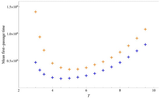 Mean first-passage time of sequence A (blue cross) and sequence B (orange cross).