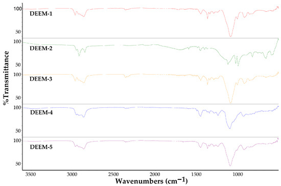 The infrared spectra of these demulsifiers were recorded using the Thermo Nicolet 5700 FT-IR spectrometer with attenuated total reflectance (ATR) FT-IR spectroscopy. The spectra were collected in the spectral range between 4000 cm−1 and 400 cm−1 with 1 cm−1 resolution (Figure 1).