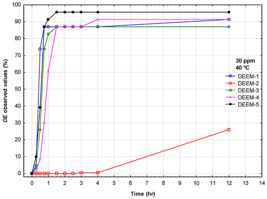 Each demulsifier was tested at five concentrations, four temperatures, and twelve time intervals. Since concentration and temperature may not remain stable over time, this investigation conducted preliminary demulsification tests using a bottle test in field conditions at 40 °C with a demulsifier concentration of 30 ppm. Figure 2 presents the relationship between demulsification efficiency on the time required for all demulsifiers under field conditions. DEEM-2 exhibited the lowest demulsification efficiency across all tested conditions. The benzenesulfonic acid headgroup in DEEM-2 imparts strong hydrophilicity, yielding a relatively high HLB value compared to the other alkoxylated demulsifiers (DEEM-1, DEEM-3–DEEM-5). In a water-in-oil (W/O) emulsion, effective demulsifiers must partition preferentially into the oil phase and accumulate at the oil–water interface. High polarity of DEEM-2 limits its oil-phase solubility and thus its interfacial adsorption, preventing it from effectively disrupting the rigid asphaltene/surfactant film that stabilizes water droplets. Furthermore, FT-IR analysis (Figure 1) highlights the strong S=O stretching band around 1100 cm−1 for DEEM-2, confirming extensive sulfonic functionality. While sulfonates can be excellent demulsifiers in oil-in-water systems, in W/O emulsions, they can often form reverse micelles in the aqueous phase rather than penetrate and fluidize the oil-side interfacial layer. Consequently, DEEM-2 fails to lower the interfacial tension sufficiently to promote the coalescence of water droplets. This contrasts with the more amphiphilic architectures of DEEM-1 and DEEM-5, which achieve balanced partitioning and efficient interface disruption.