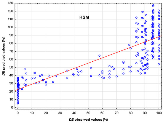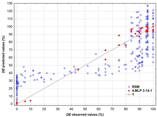 The comparison between predicted and observed DE values for the model developed by the neural network MLP 3-14-1 and RSM.