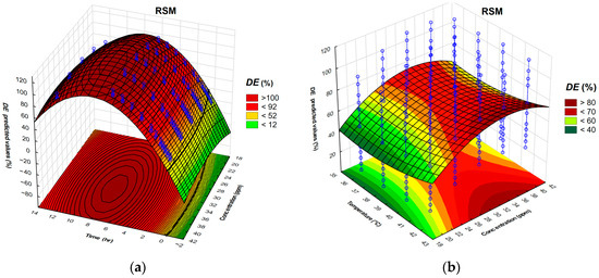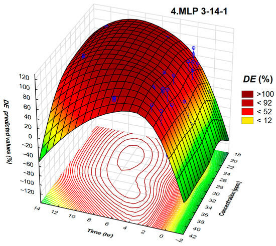 Four regions with high DE values are distributed at the edges of the 3D surface representing neural network results. The neural network approach achieves improved accuracy compared to the response surface analog (Figure 5b). This implies properly trained neural network indicating a well-fitting collection of data points.