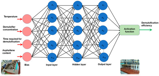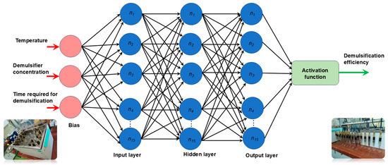 Statistical methods are valuable tools for addressing problems in the petroleum industry including the preparation of crude oil for transport, petroleum refining, or the separation of petroleum products. These methods have also been used in the demulsification of W/O emulsions [29,30,33,40,41,42,43,44,45]. In many studies, a central composite design (CCD) was employed to design experiments, and the analysis of variance (ANOVA) was used to predict the influence of variables on demulsification efficiency. Further, the response surface method (RSM) was used to predict demulsification efficiency and to determine optimal conditions [29,30,33,40,41,43,45]. These investigations revealed that an optimal demulsification efficiency exists as a dependent variable. The authors systematically analyzed demulsification based on various factors, including the nature of the demulsifier, demulsifier concentration, temperature, pH, oil/water ratio in the emulsion, settling time, etc. Despite many studies conducting the analytical analyses of demulsification efficiency, the influence of relevant variables and the sensitivity of statistical methods were often overlooked [40,41,42,43,44,45]. One major drawback is the necessity to conduct experiments with smaller sample sizes for such a sensitive process, increasing the likelihood of not capturing the optimal range for demulsification efficiency. For these reasons, a full factorial design paired with appropriate statistical methodology should be adopted to mitigate risk when working under high temperatures and concentrations, facilitating cost-effective chemical demulsification. Neural networks were investigated as promising tools in the petroleum industry for solving similar problems [46]. The investigation of neural networks as potential tools in the petroleum industry for solving similar problems has demonstrated their precision and reliability [1,47,48,49,50]. Additionally, they can detect complex nonlinear relationships between independent and dependent variables through various training algorithms.