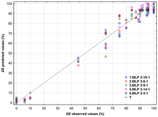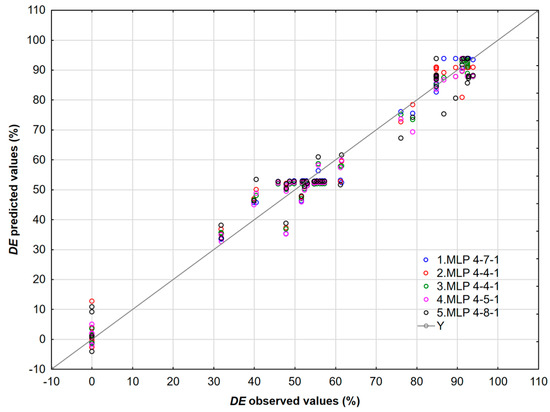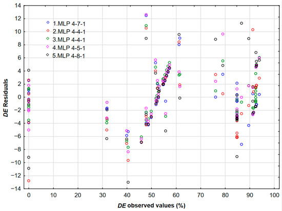 The highest validation performance is observed for the logistic output activation function and hyperbolic tangent hidden activation. Furthermore, this neural network exhibited the lowest validation error. Figure 7 shows the deviations between the experimentally determined DE values (observed) and those predicted using the selected MLP 3-14-1 and other neural networks.