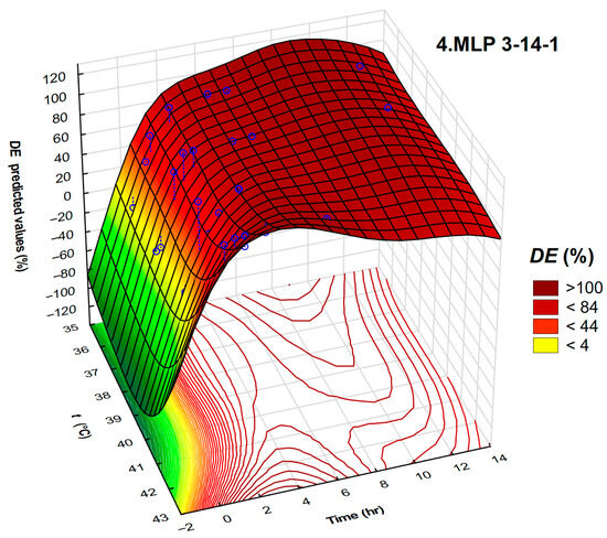 Quantitatively, the final RSM model achieved R2 = 0.657 and RMSE = 7.8% DE, whereas the MLP 3-14-1 achieved R2 = 0.991932 and RMSE = 1.4% DE. On a standard eight-core workstation, fitting the RSM polynomial required 3 s, while the full MLP search and training pipeline (10,000 networks) was completed in 8 min. Given the 80% reduction in prediction error, this computational method is justified for field screening.