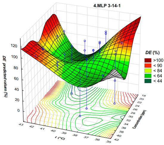 Interdependence of DE, temperature, and concentration of the demulsifier DEEM-5 for neural network 4.MLP 3-14-1 is shown in Figure 11.