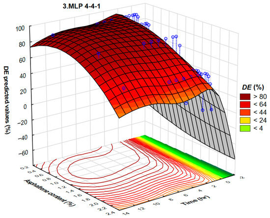 Asphaltene content varied from 0.41 to 2.15%. It is well known that asphaltenes act as natural-occurring surfactants present in the crude oil. Due to the high asphaltene content, crude oils can act not only as Newtonian fluids but also as non-Newtonian (pseudoplastic or even Bingham’s) fluids. The results of automated neural networks and the interdependence of demulsification efficiency, asphaltene content, and time for MLP 4-7-1 and MLP 4-4-1 are presented in Figure 17 and Figure 18.