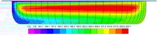Kaufman et al., published analyses of recirculating flow [5,6]. The analysis by Mohr et al. [4] has been incorporated in many textbooks, for instance, Bernhardt [7], Schenkel [8,9], McKelvey [10], and Tadmor and Klein [11]. Many papers have been published on 3D flow in single-screw extruders using computational fluid dynamics, CFD. Liao published a numerical analysis of recirculating flow [12]. Rauwendaal [13] published an analysis of non-isothermal flow of a power law fluid in single-screw extruders including leakage flow over the flight. He found that the recirculating flow tends to produce a region of high temperature in the center region of the channel. An example of this high-temperature region is shown in the color contour plot of the melt temperatures in the channel cross-section in Figure 2. The left side of the channel is the pushing flight flank; the right side of the channel is the trailing flight flank. The top is the barrel surface, and the bottom is the root of the screw.