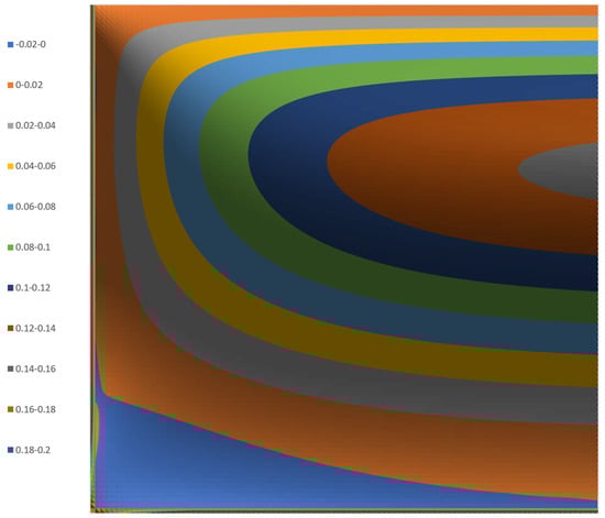 The flow rate surface plot for a square channel looks like a mountain with a flat bottom at the screw surface with a gently increasing slope. The barrel side has a steeply sloped surface due to the fact that the barrel velocity is −1. The peak of the surface occurs at and . The surface plot is generated using a 100 × 100 matrix with one hundred steps along the height of the channel and one hundred along the width of the channel. Figure 25 shows the flow rate contour plot for the square channel.