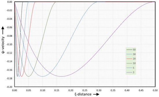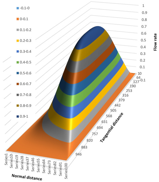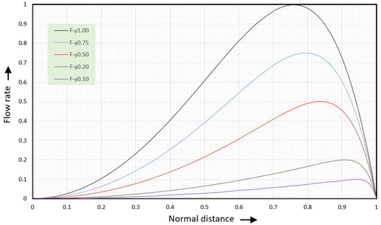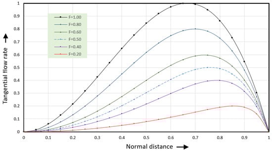 Figure 21 shows the tangential flow rate versus normal distance for five values of the normal flow rate . For , the maximum flow rate equals 1 at . For , the maximum flow rate occurs at . For , the maximum flow rate occurs at . For , the maximum flow rate occurs at . For , the maximum flow rate occurs at .