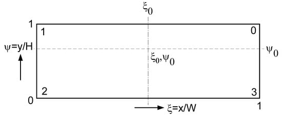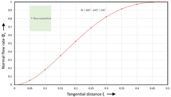 This means that the width of the normal flow region is approximately 1.5 H. For slit flow with , the width of the normal flow region is less than half the width of the channel. The normal velocities are expressed as a third-order polynomial of the dimensionless x-coordinate . At the left wall and at the center of the channel , see also Figure 6.